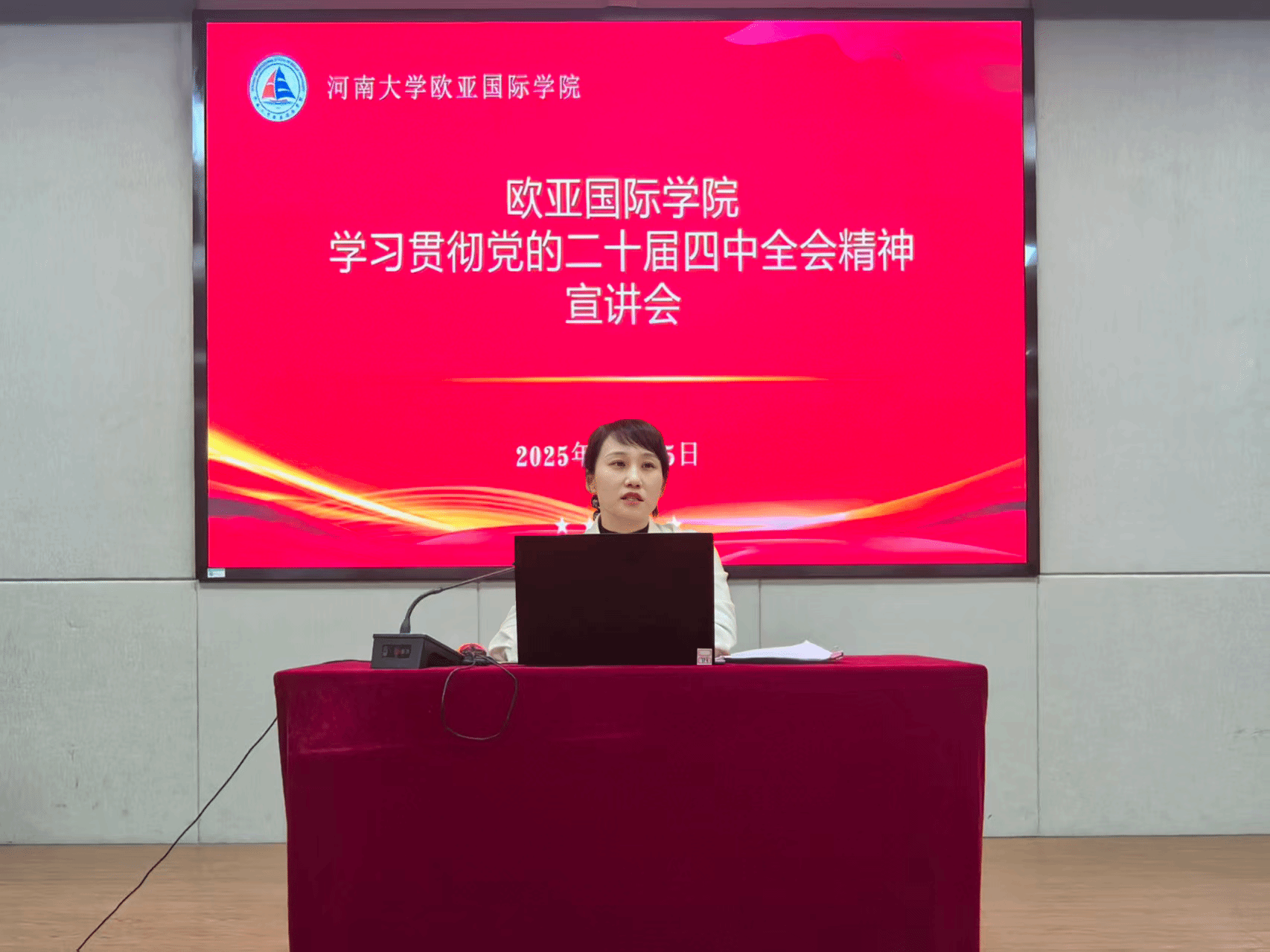 刘佳明进行总结。她表示,全院上下要把学习宣传贯彻党的二十届四中全会精神作为当前和今后一个时期的重大政治任务,将全会精神转化为推动学院改革发展的实际行动,争做政治坚定的“引路人”、业务精湛的“实干家”、勇于担当的“开拓者”,凝心聚力打造国际合作办学特色品牌,为学校“双一流”建设和中原大地中国式现代化建设贡献欧亚力量。