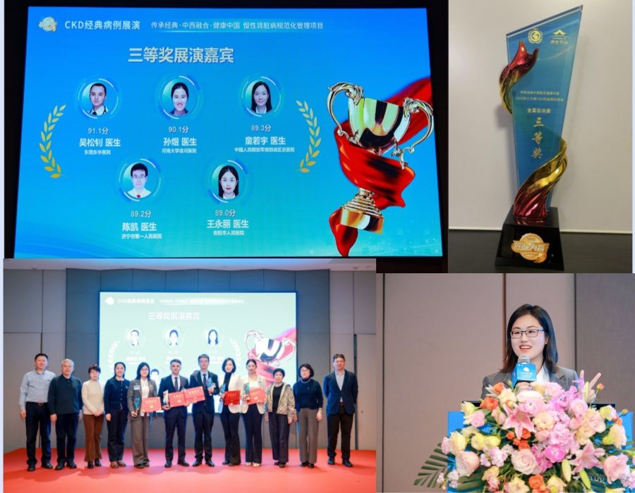 11月26日,在杭州举行的《中国中西医结合学会肾脏疾病专业委员会2025年学术年会》上,作为中国医药教育协会“百医护肾—慢性肾脏病诊疗能力提升项目”系列活动“CKD经典病历展演”全国总决赛举行中,由时军主任带队,孙煜医师代表参赛,最终荣获全国总决赛第五名(三等奖)。此次获奖展示了医院在慢性肾脏病规范化诊疗方面的实践经验,对提升中青年医师临床与演讲能力具有示范意义。