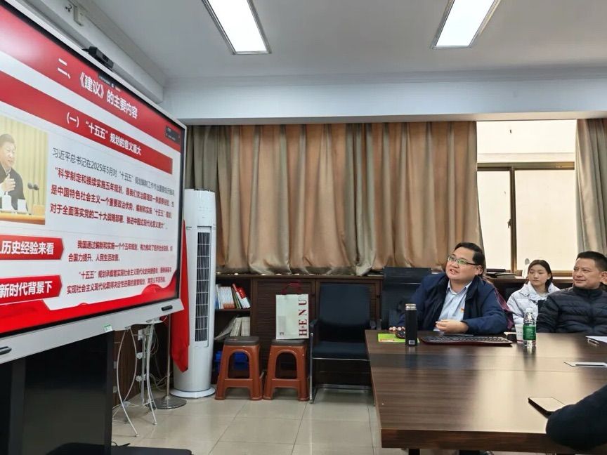 为深入学习贯彻党的二十届四中全会精神,切实把思想和行动统一到党中央决策部署上来,12月23日下午,音乐学院在党建活动室举办学习贯彻党的二十届四中全会精神专题宣讲报告会。学院特邀河南省青年理论宣讲专家、河南大学招生办公室主任高冬东作专题辅导。院党委书记王志国主持报告会。学院全体班子成员、科级干部、各党支部书记在现场参加学习,全院师生通过线上会议同步收听收看,实现学习全覆盖。