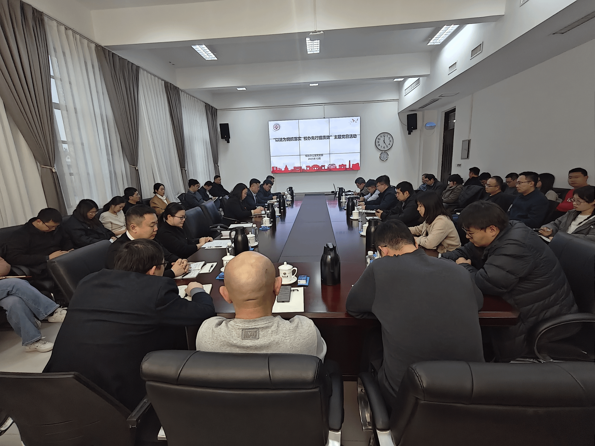 12月26日下午,校长办公室党支部在郑州龙子湖校区友兰学堂中楼301会议室开展“以法为纲抓落实,校办先行提质效”主题党日活动。机关党委组织各职能部门党员骨干38人到场观摩,活动由校长办公室党支部书记、主任李鹤翔主持。