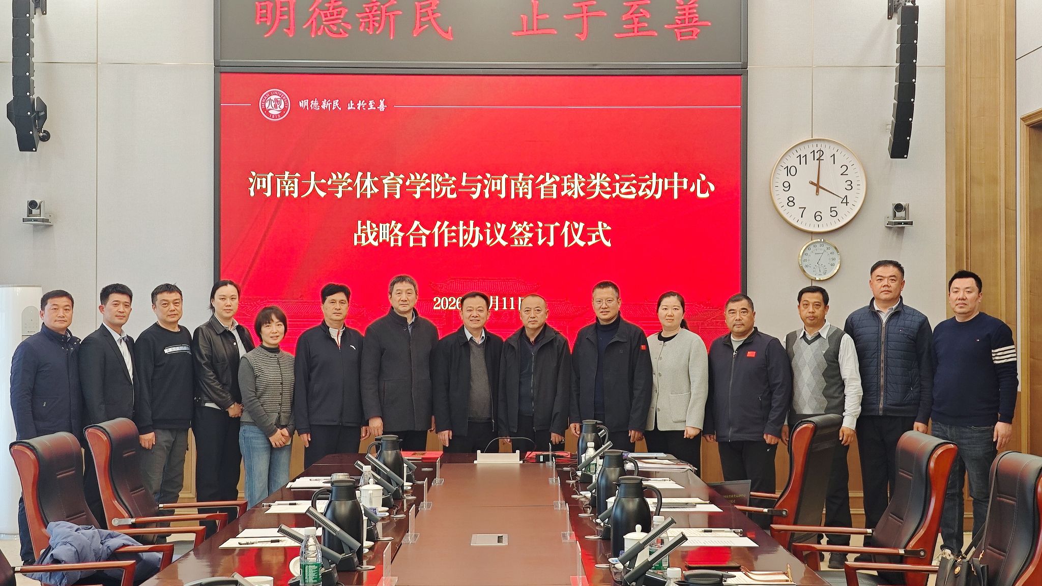 3月11日下午,河南大学体育学院与河南省球类运动中心战略合作协议签订仪式在郑州龙子湖校区举行。体育学院领导班子及省球类运动中心领导班子成员共同出席。仪式由学院副院长姚远主持。