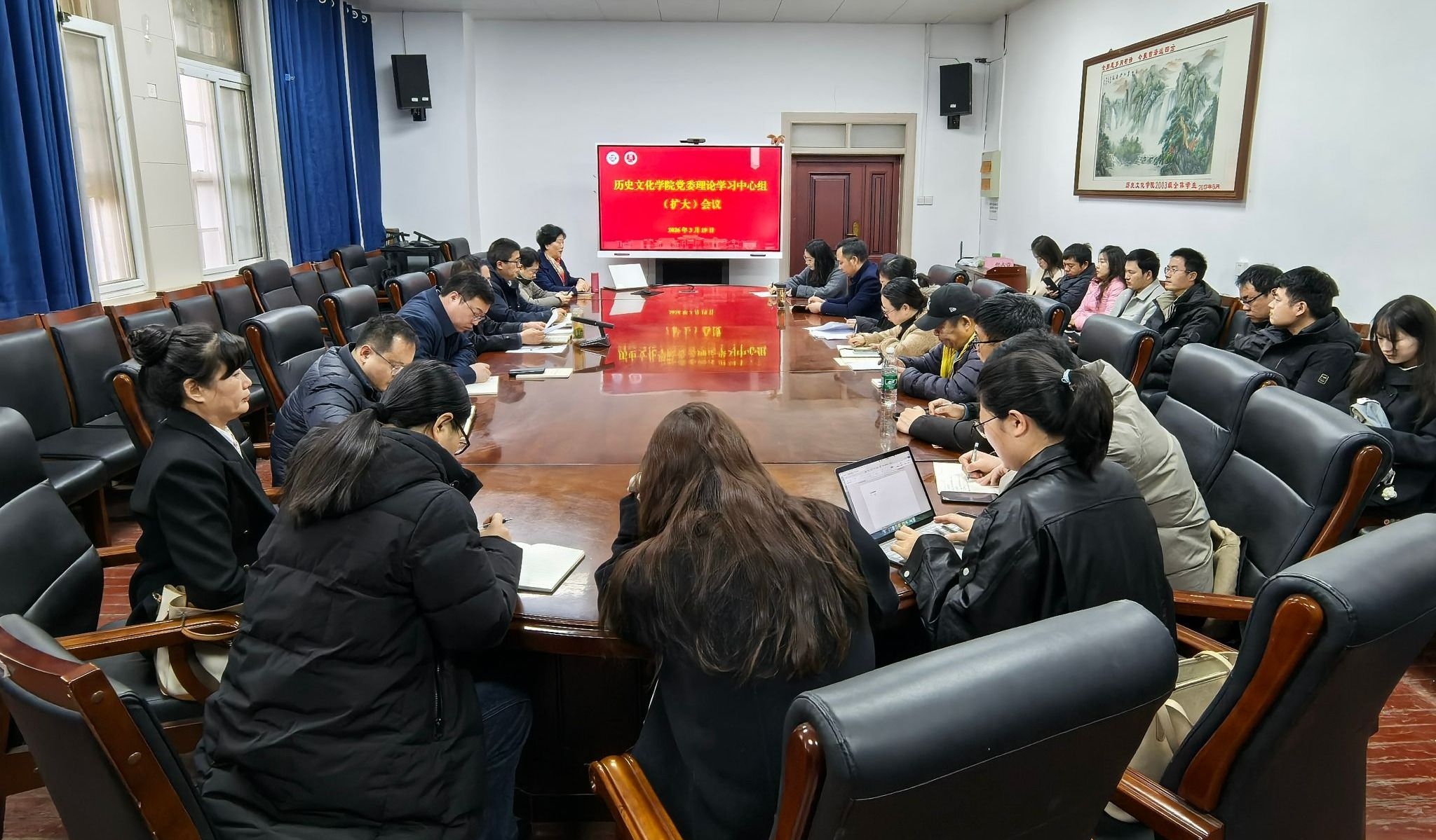 为深入学习贯彻2026年全国两会精神,3月19日上午,历史文化学院在三楼会议室召开党委理论学习中心组(扩大)会议,传达学习习近平总书记在全国两会期间的重要讲话和全国两会精神。学院党委委员、各党支部书记、教研室主任、科室负责人及教师代表参加,学院党委书记张占党主持会议。