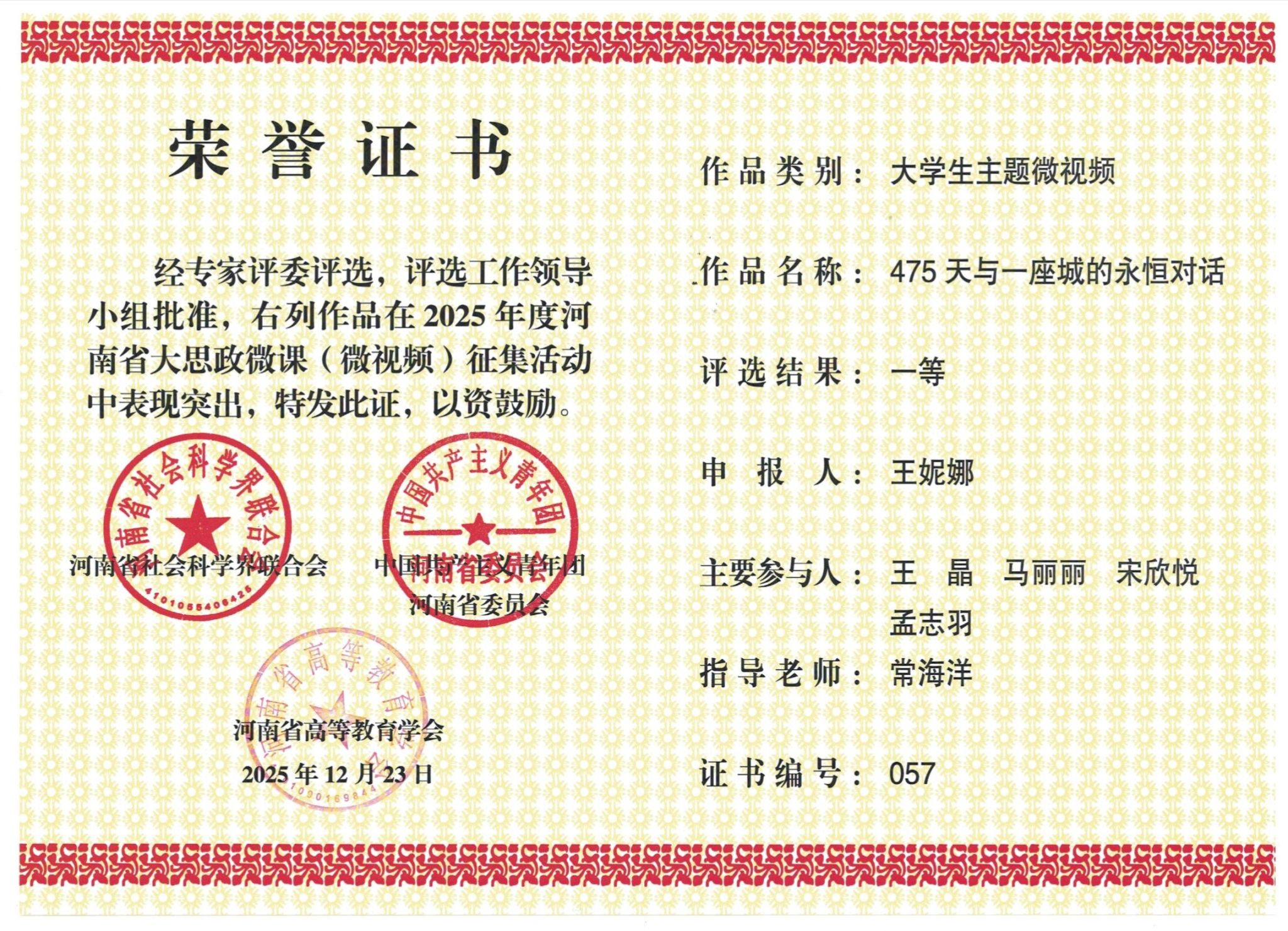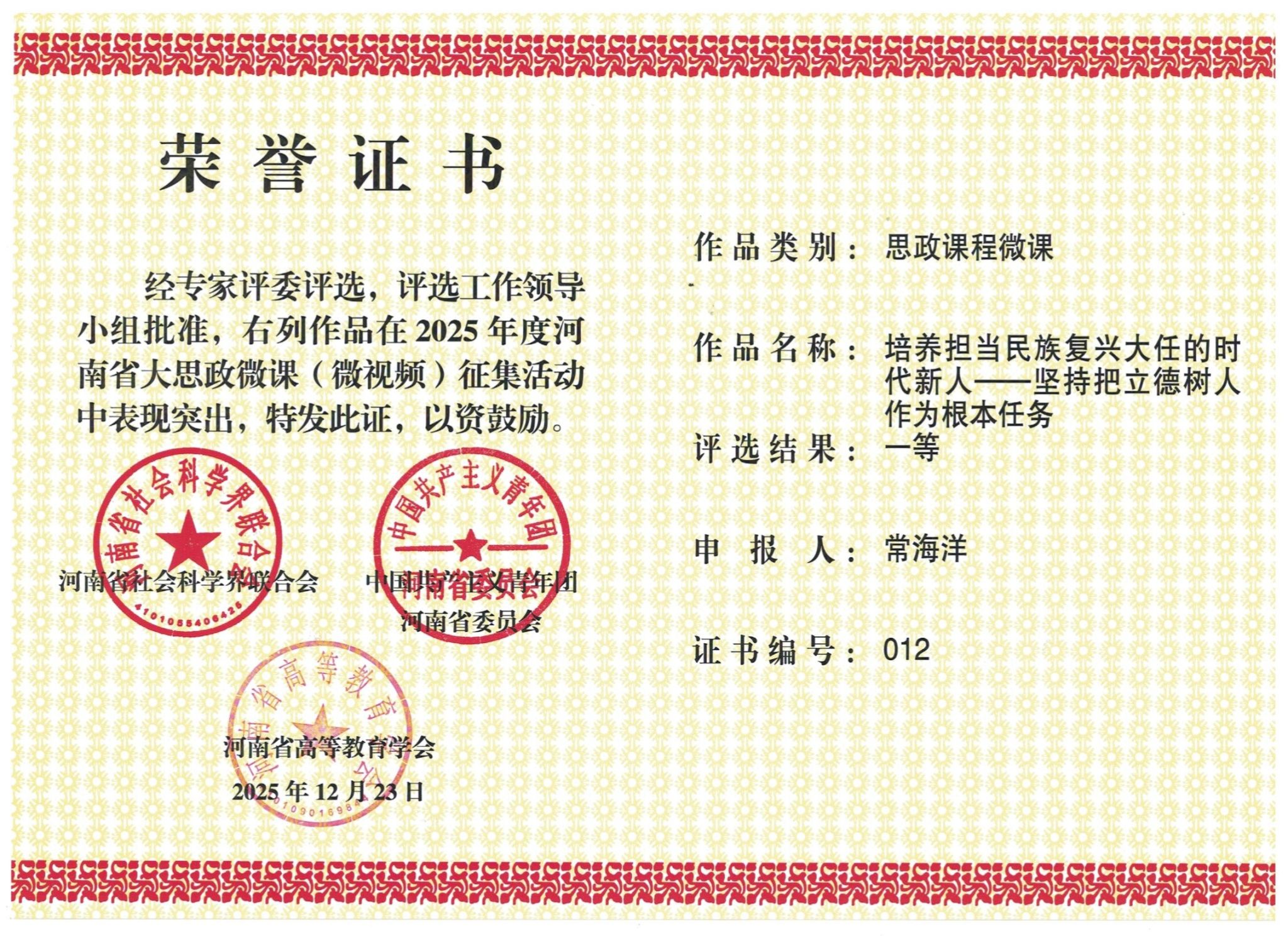 近日,由河南省社会科学界联合会、共青团河南省委员会、河南省高等教育学会联合主办的2025年度河南省大思政微课(微视频)征集活动评选结果揭晓,教育学部常海洋老师主讲的微课《培养担当民族复兴大任的时代新人——坚持把立德树人作为根本任务》荣获思政课程微课组一等奖,常海洋老师指导、王妮娜同学及其团队创作的微视频《475天与一座城的永恒对话》荣获大学生主题微视频组一等奖。