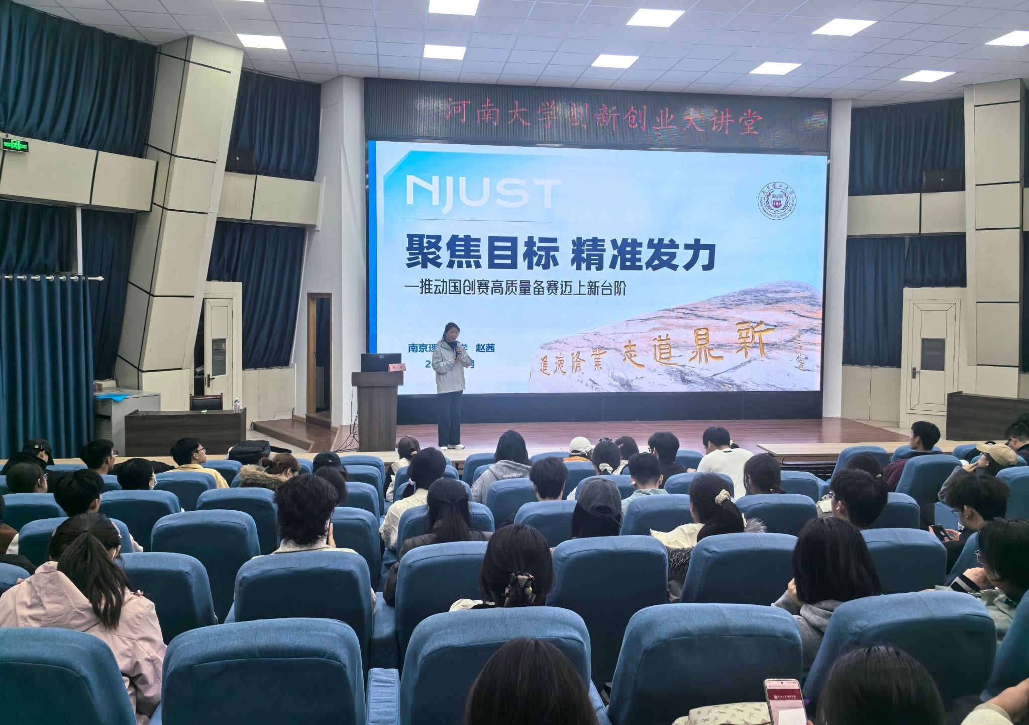 4月8日,由河南大学就业创业指导中心、校团委联合主办的2026年创新与创业大讲堂第一讲“聚焦目标,精准发力——推动科创竞赛高质量备赛迈上新台阶”在金明校区锥形报告厅举行。南京理工大学创新创业教育学院副院长、副研究员赵茜应邀作专题报告。活动由就业创业指导中心副主任栗晓文主持。