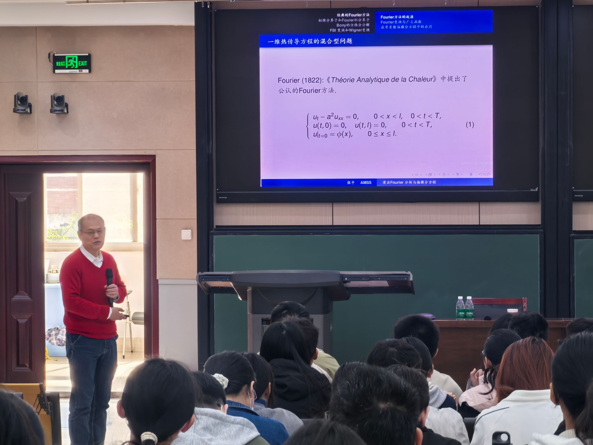 报告中,张平谈及Fourier为求解热传导方程提出的“三角级数展开理论”时指出,该理论虽一度引发学界争议,却为Fourier分析奠定了基础,并成为偏微分方程求解的核心工具之一。他表示,原始创新是数学发展的核心动力,科研应勇于突破、深耕原创,减少跟风式研究。此外,张平还阐述了精读经典的重要性,倡导师生通过研读原著、相互讲授夯实数学基础,并回顾了广义函数理论引入国内的历程,让在场师生体会到老一辈学者的治学奉献精神。