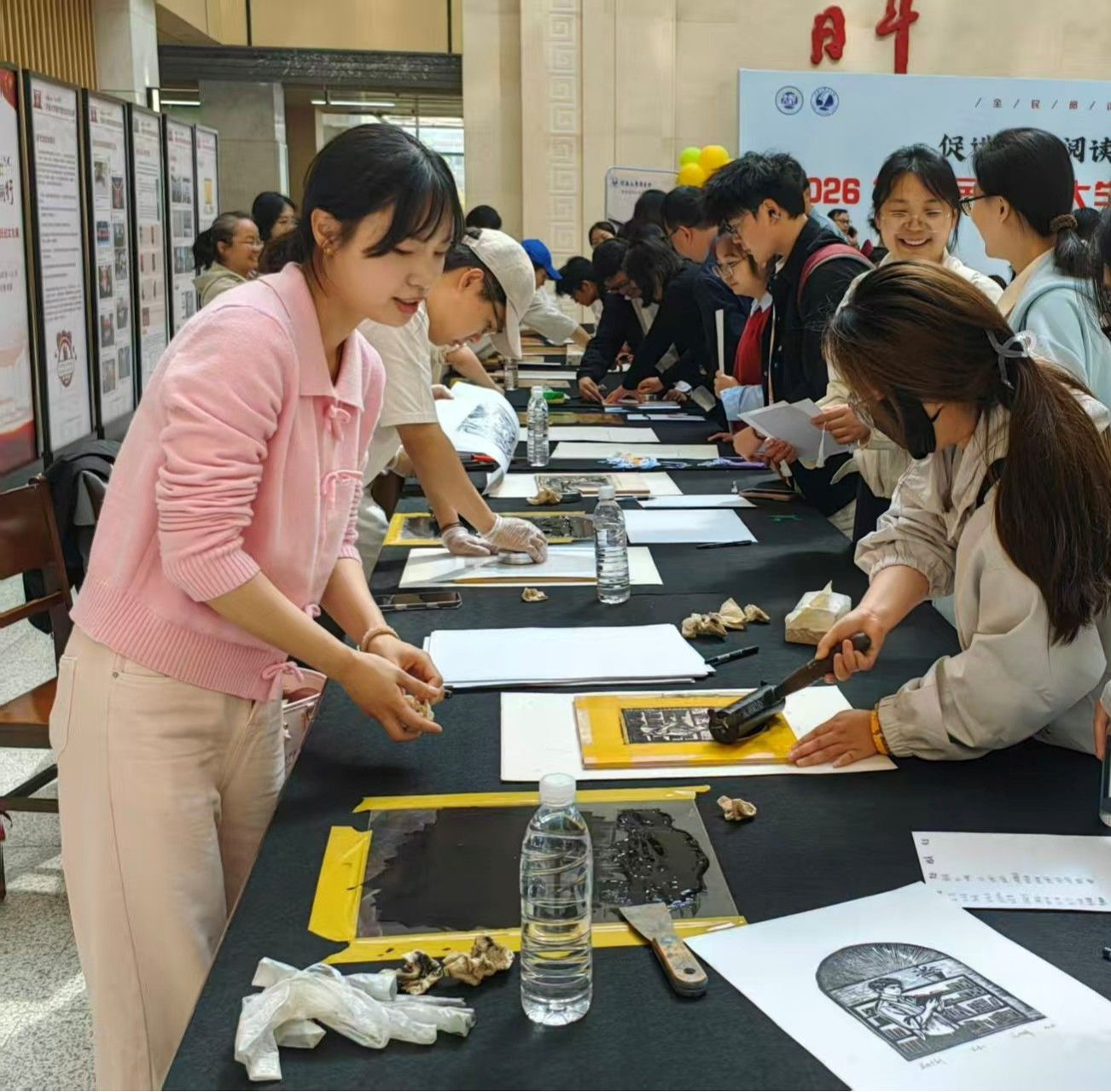活动以“版画+阅读”为主题,推动艺术实践与书香校园深度融合,既丰富了校园文化生活,又提升了师生审美素养与人文情怀,为学校“全民阅读活动周”增添艺术亮色,实现美育浸润与书香育人同向同行、协同发力。杨波带领版画专业研究生团队,精心创作了“静心阅读”“书是人类进步的阶梯”等主题版画,将阅读理念、传统文化与艺术创作有机结合。在场师生在沉浸式手工印制体验中感受艺术魅力、品读书香内涵。大家纷纷表示,这是一场生动深刻的美学实践课。