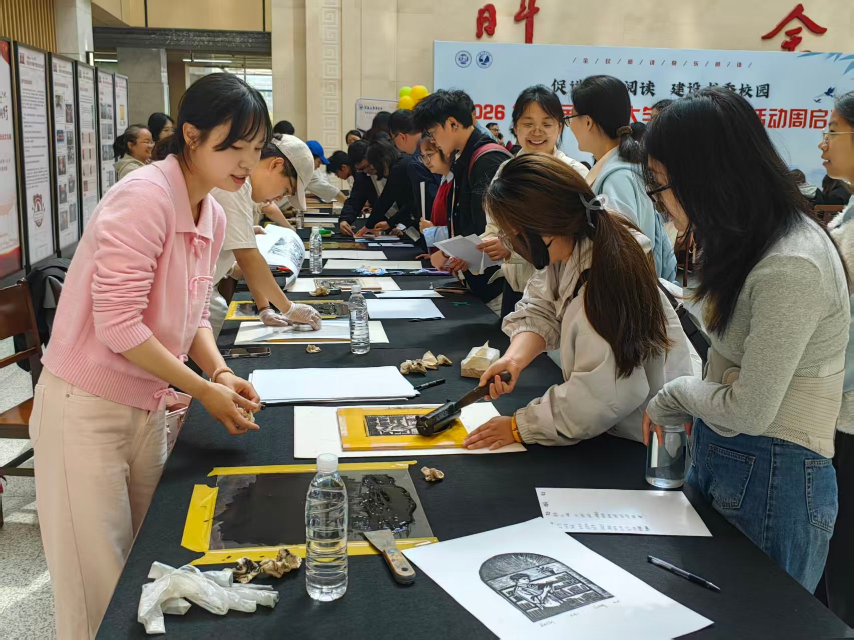 现代版画印刷同样吸引了众多师生驻足体验。同学们在专业老师的指导下,均匀滚涂、仔细铺纸、小心拓印,一步步完成属于自己的版画作品。该活动由河南大学图书馆、民盟河南大学委员会、河南大学公共艺术教研部共同主办,以“版画+阅读”为主题,将艺术体验融入校园文化生活,在方寸之间传递书香与匠心,切实提升师生的审美素养与人文情怀。