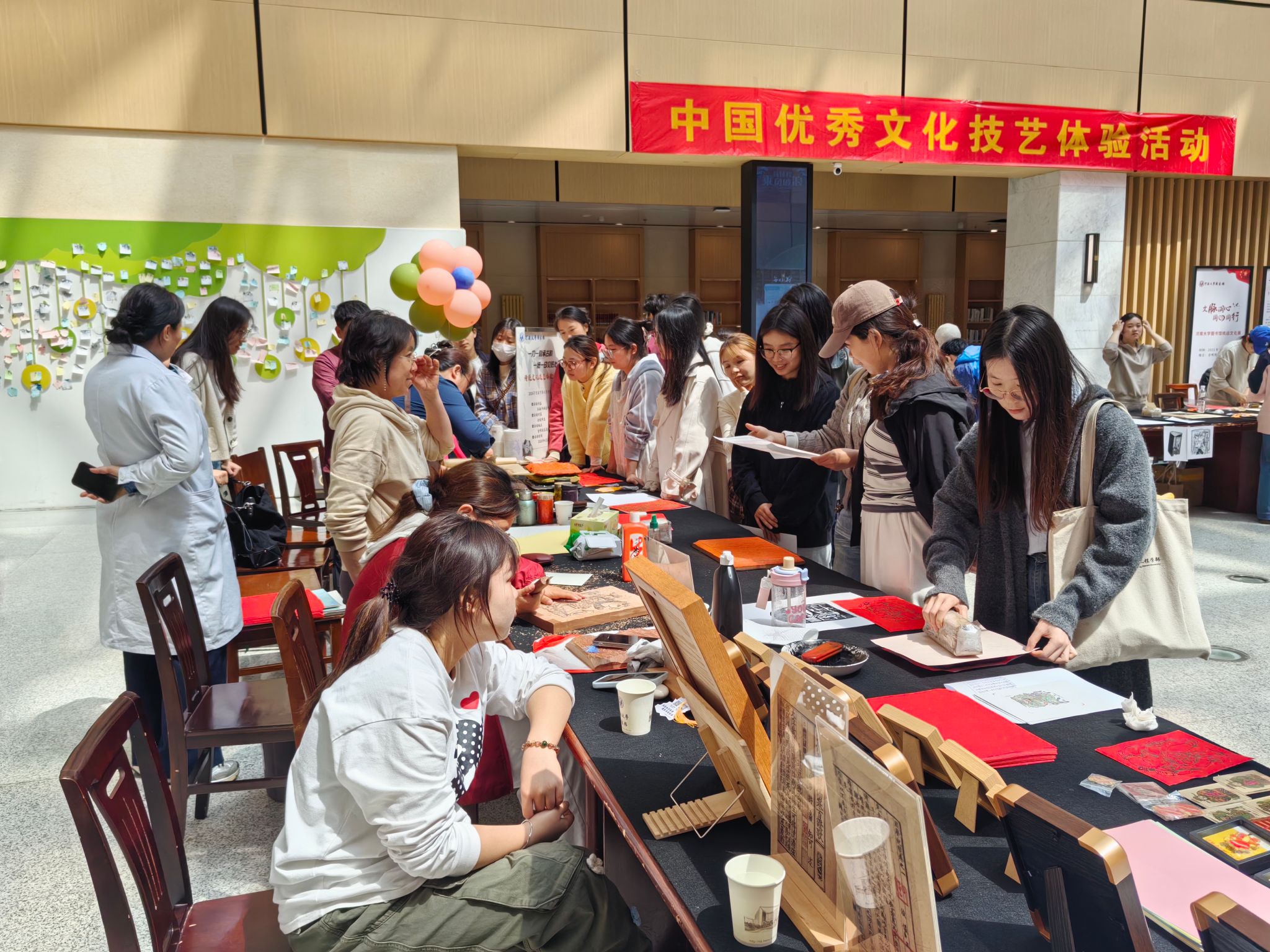 在“一刀一刻承古韵 一纸一印见匠心”——传统文化技艺体验活动区,师生们在专业老师指导下,亲手体验木版年画、雕版刻印、拓印、藏书章、套色印章等传统技艺。