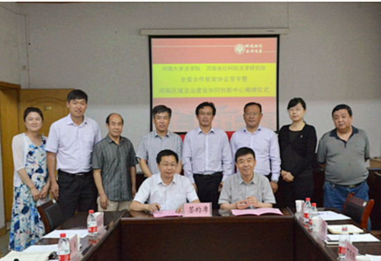 5月24日上午,法学院与河南省社科院法学研究所在法学院二楼会议室举行全面合作框架协议签约暨河南区域法治建设协同创新中心揭牌仪式。省社科院副院长丁同民研究员,法学所党支部书记张林海研究员、法学所副所长李宏伟等一行与法学院全体领导班子成员参加签约仪式,仪式由法学院副院长郑铭勋主持。
