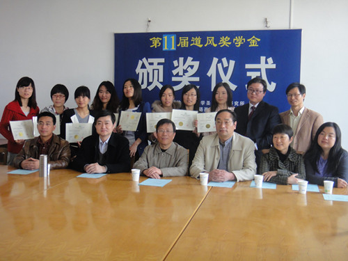 2013年4月11日下午,第十一届道风奖学金颁奖仪式在文学院比较文学与世界文学教研室举行。研究生院常务院长孙君健,文学院院长李伟昉、副院长刘进才,比较文学与比较文化研究所主任梁工,以及比较文学教研室相关教师、研究生参加颁奖典礼。
