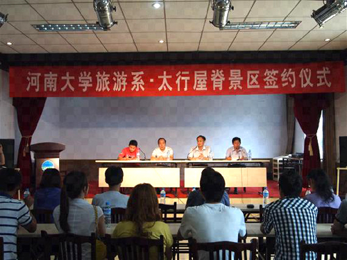 河南大学历史文化学院和林州市大自然旅游开发有限公司共建“河南大学教学实习基地”签约、挂牌仪式于2011年7月4日上午在太行屋脊景区举行。林州市旅游局副局长高贵山、林州市大自然旅游开发有限公司董事长王俊昌、河南大学历史文化学院副院长刘克辉等及实习队全体师生参加了签约与挂牌仪式,仪式由林州市大自然旅游开发有限公司营销总监轩武昌主持。