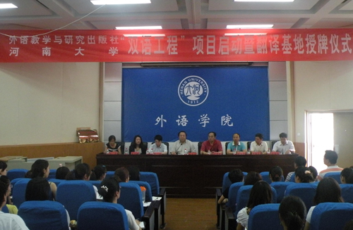 6月28日上午,外语教学与研究出版社与河南大学“双语工程”启动项目签约暨翻译基地挂牌仪式在外语学院北楼三厅举行。我校常务副校长赵国祥、外语教学与研究出版社总编辑助理甄强等出席。河南大学翻译硕士教育中心部分教师和学生代表也参加了此次仪式,仪式由外语学院副院长杨朝军主持。