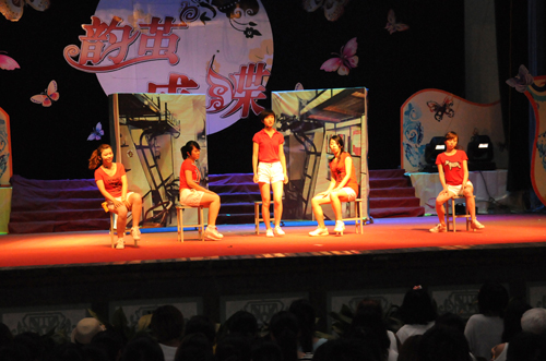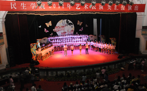 六月之末,他们的青春和激情在夜空飞扬。2011年6月20日晚,由民生学院主办、2008级播音与主持艺术专业承办的“韵茧成蝶——民生学院艺术表演类汇报演出”在明伦校区大礼堂隆重举行。常务副校长赵国祥,校党委副书记王凌,工会主席朱恒宽,河南日报报业集团副总编辑、民生学院党委书记王国庆,民生学院院长施昌海出席。我校党委宣传部、学生处、团委、保卫处、新闻传播学院有关负责人,河南日报报业集团机关党委、文明办、工会等部门负责人及民生学院全体党政领导和师生1500余人一同观看了演出。