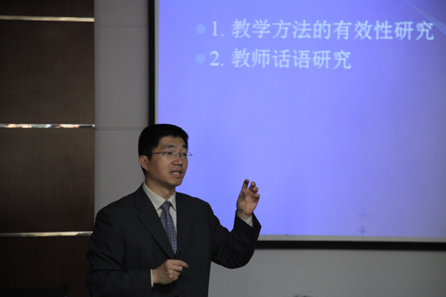 蔡金亭从师生两个角度分析研究课题该注意的问题,并将母语对外语学习的影响及教学中外语的易错点介绍给在座的师生。他讲到,研究课题的方法有很多,但必须要先确定研究课题的具体信息,其次阅读大量的有效文献,确定研究方案,接着再对方案中的具体数据进行统计,而结论的观点要与主题一致,只有这样才能真正的做好研究。