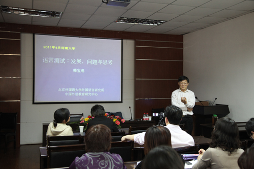 2011年4月14日,15日,22日,北京外国语大学韩宝成教授、解放军外国语学院蔡金亭教授与全国大学英语教学指导委员会河南分会会长邱天河教授分别在我校大学外语教学部报告厅作了 “语言测试:发展、问题与思考”、“外语教学研究的课题与方法”和“外语教师如何搞科研”的专题报告。大学外语教学部主任穆春玲主持了三场讲座。三位教授精彩的讲演受到我校外语教师的热烈欢迎。