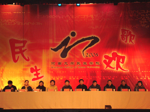 2006年12月28日下午,民生学院2005—2006 年度学生工作表彰暨文艺演出汇报会在税校大礼堂隆重举行。河南大学纪委书记王凌,学生处、校团委、民生学院有关负责同志,河南万宝股份有限公司副总经理郭春雨及民生学院2000余名师生代表参加了大会。表彰大会由民生学院党委书记王文科主持。