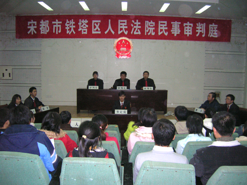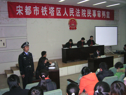 12月10日,我校科技馆一楼报告厅座无虚席,气氛庄重,由河南大学团委主办、法学院团总支承办的“模拟法庭”随着一声法槌的敲响如期与观众见面。开封市中级人民法院民一庭庭长殷雷萍及校团委、法学院、就业指导与服务中心等相关负责人出席了活动。