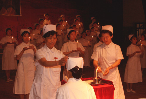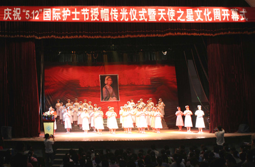 我校护理专业03级学生刘锦丹在采访中说,当我看到师姐们深深一跪的一瞬间,我深深感受了作为一名护士肩负的责任,作为一名在校学生在今后的学习中,要努力学习,把南丁格尔精神发扬光大。