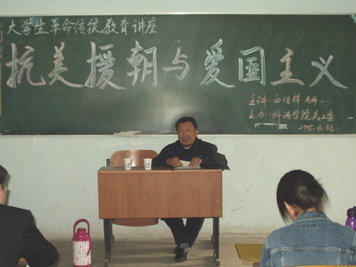 为了深入贯彻落实中央十六号文件精神,发挥老同志的优势和作用,加强和改进大学生思想政治教育工作,在清明节到来前夕,3月31日下午,外语学院党总支、关工委邀请我校关工委副主任白传祥老师在外语楼二厅举办了一场以“抗美援朝与爱国主义”为主题的大学生革命传统教育讲座。