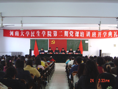 为贯彻落实党的十六届三中、四中全会精神和《中共中央、国务院关于进一步加强和改进大学生思想政治教育的意见》精神,进一步加强学院学生的思想政治教育工作,加强对入党积极分子的培养和教育,夯实和推进学生党组织队伍建设,民生学院于3月24日下午2时30分在10号楼128教室举行了河南大学民生学院第二期党课培训班开学典礼并安排了第一次讲座。院全体党政领导参加了开学典礼。