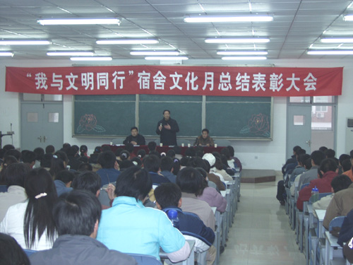 在表彰大会上,团总支书记陈河山宣布大会开幕,之后,学生代表发言。王言书同志对宿舍文化月活动以及同学们表现出的良好精神风貌给予了充分肯定,“宿舍文化对学生们的学习生活有很重要的熏陶作用,在一个积极向上的氛围中,同学们能够相互敦促共同进步。”他鼓励同学们继续保持这种氛围。最后,党总支副书记王桂宣布了“文明宿舍”、“优秀手工艺品”和“优秀组织班级”获得者,并为获奖者颁发了奖状和奖品。