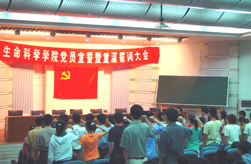 2004年6月1日晚,校科技馆二楼报告厅内庄严肃穆,主席台正中一面鲜红的党旗分外引人注目,生命科学学院新党员宣誓暨老党员重温誓词大会在这里隆重举行,包括院领导在内的百余名教职工生党员、预备党员以及二百多名入党积极分子参加了本次大会。民主党派人士、省政协委员、生命科学学院院长宋纯鹏博士也应邀与会。会议由海富生副书记主持。