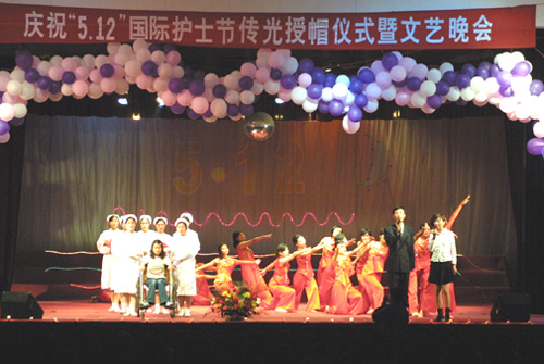 5月11日晚,庆祝活动达到了最高潮,——护理学院庆祝‘5.12’国际护士节授帽传光仪式暨文艺晚会在医药护校区大礼堂隆重举行。我校副校长史全生、护理学院院长白琴出席大会并发表了热情洋溢的讲话,团委书记周保平代表校团委向全院师生致贺辞,校党委宣传部、学生处、淮河医院、东京医院、医学院、药学院的领导、兄弟院系的团总支书记、大河报、开封电视台、开封电台、汴梁晚报等新闻媒体的朋友都光临庆祝大会。