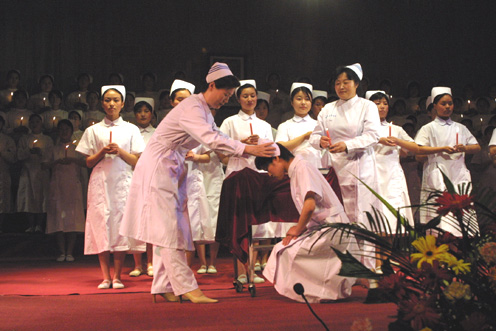 晚上7时30分,授帽传光仪式正式开始,大礼堂被一种庄严、神圣的气氛所笼罩,院长白琴、副院长周新明为即将进入临床的护生们进行了授帽。当护生们戴上白琴授予的洁白神圣的燕尾帽,当她们从周新明手中接过点燃的红烛,就意味着加入了白衣天使的行列,把护理事业作为自己奋斗终生的光荣使命。她们向着南丁格尔的画像、向着院长们深深一跪:这深深一跪,包含着她们对护理前辈无比的崇敬,使她们又经历了一次人生的洗礼,表达了她们立志献身护理事业的决心。最后,护生们站在南丁格尔画像前庄严宣誓:奉行人道主义精神,坚守救死扶伤信念,遵守护士职业道德,把毕生精力奉献给神圣的护理事业。