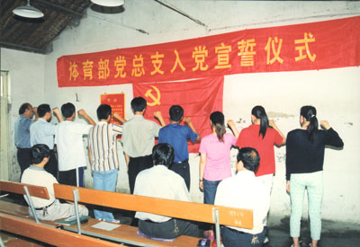 2003年6月5日下午,体育部会议室内鲜红的党旗高挂,庄严肃穆。体育部全体党员、新近发展党员和入党积极分子40余人群情振奋,喜迎中国共产党成立八十二周年和我校即将召开的第八次党代会,隆重举行新党员入党宣誓仪式。