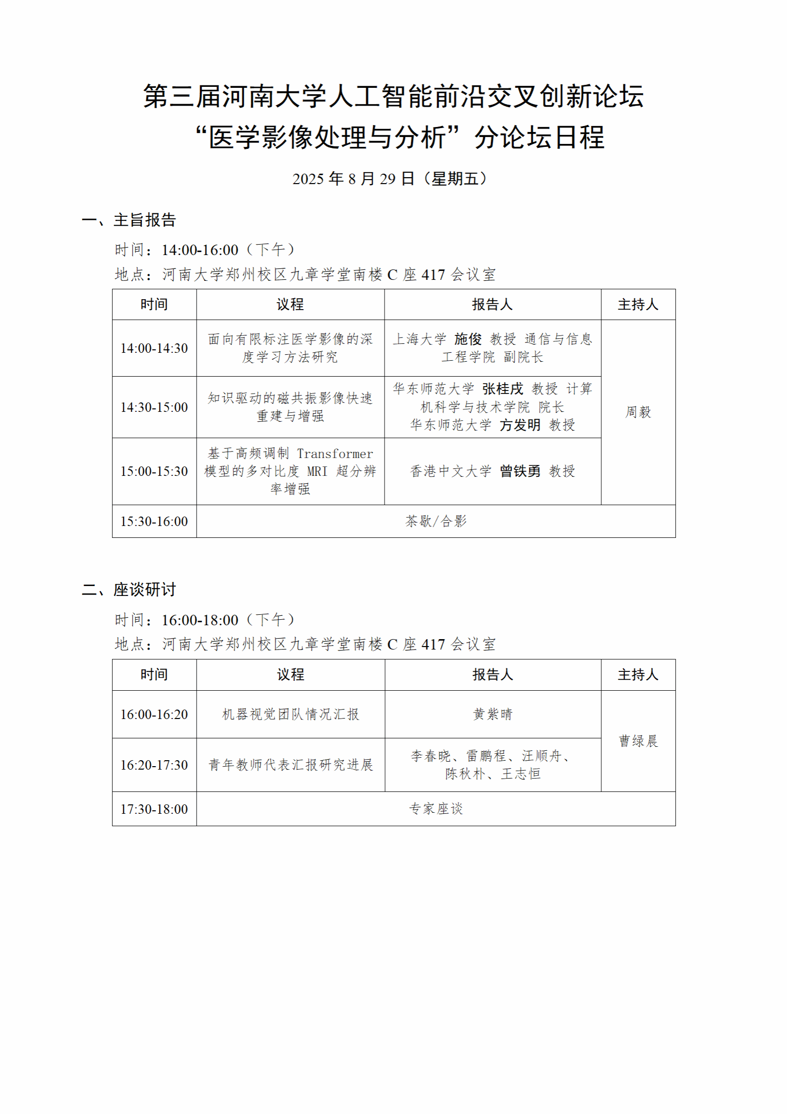 第三届河南大学人工智能前沿交叉创新论坛医学影像处理与分析分论坛(时间:8月29日)