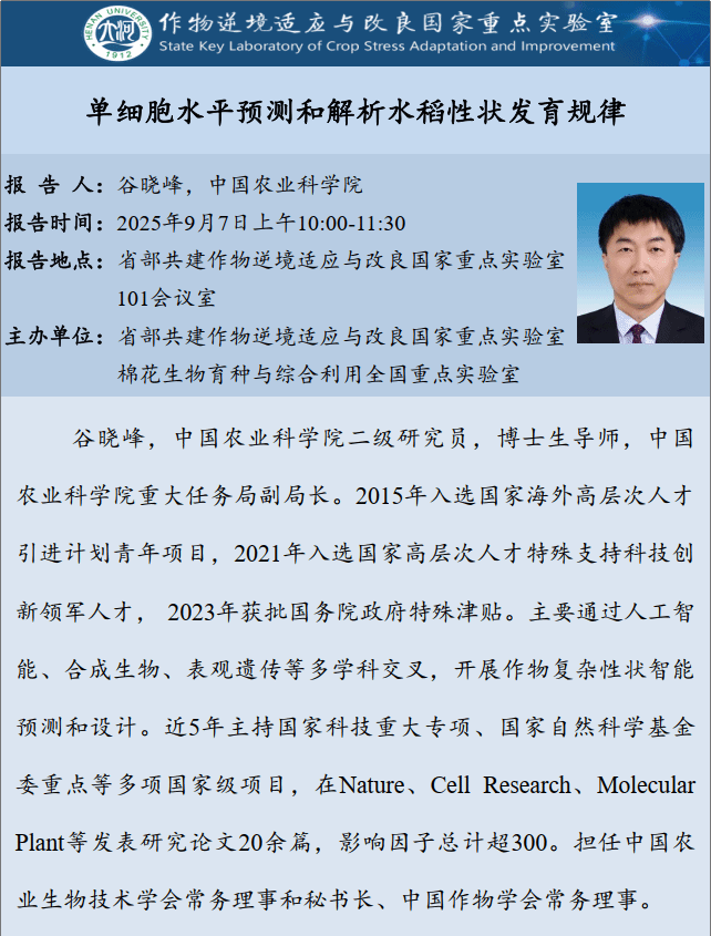 谷晓峰:单细胞水平预测和解析水稻性状发育规律(时间:9月7日)