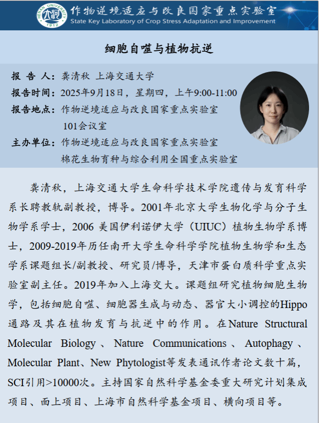 龚清秋:细胞自噬与植物抗逆(时间:9月18日)