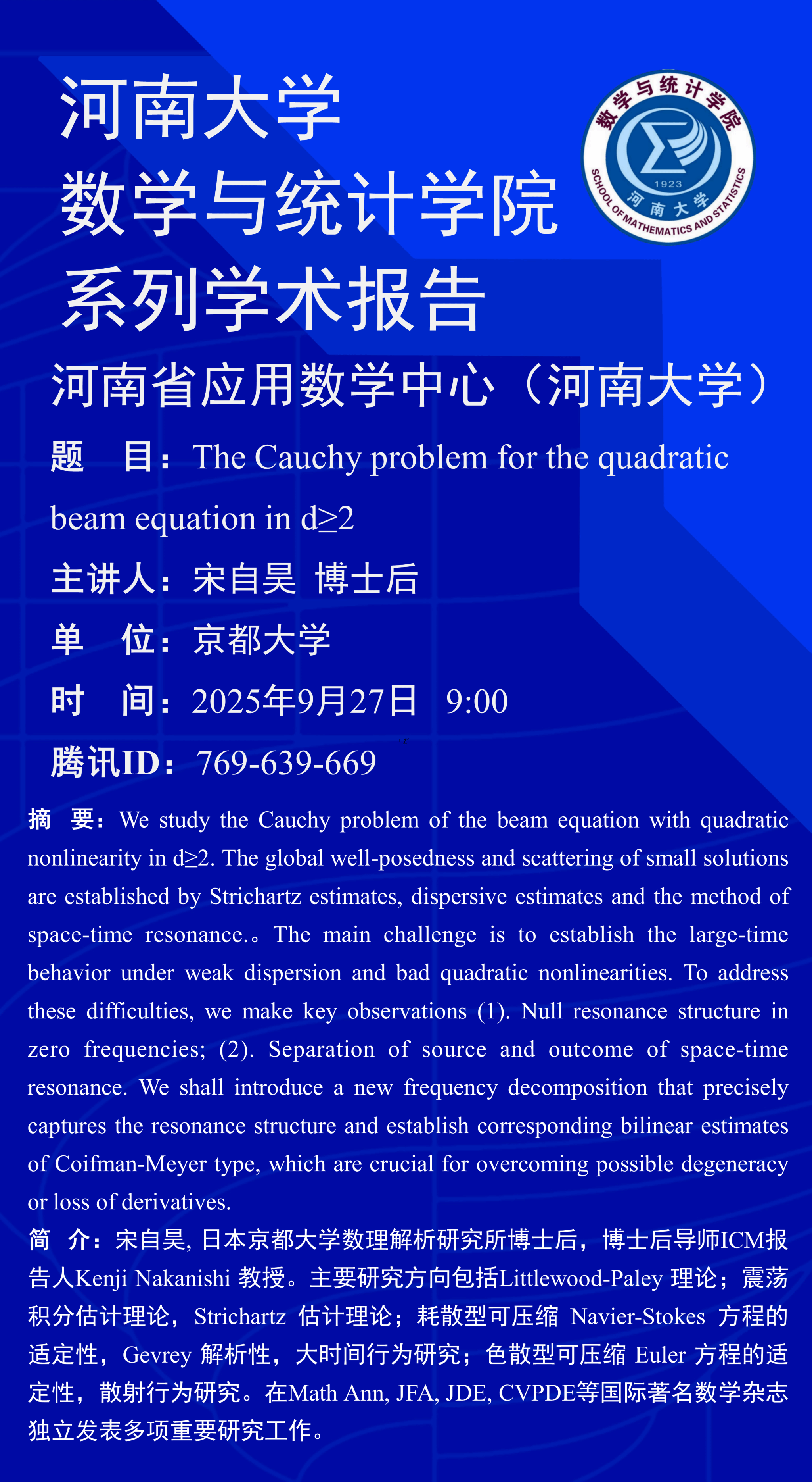 宋自昊:The Cauchy problem for the quadratic beam equation in d≥2(时间:9月27日)