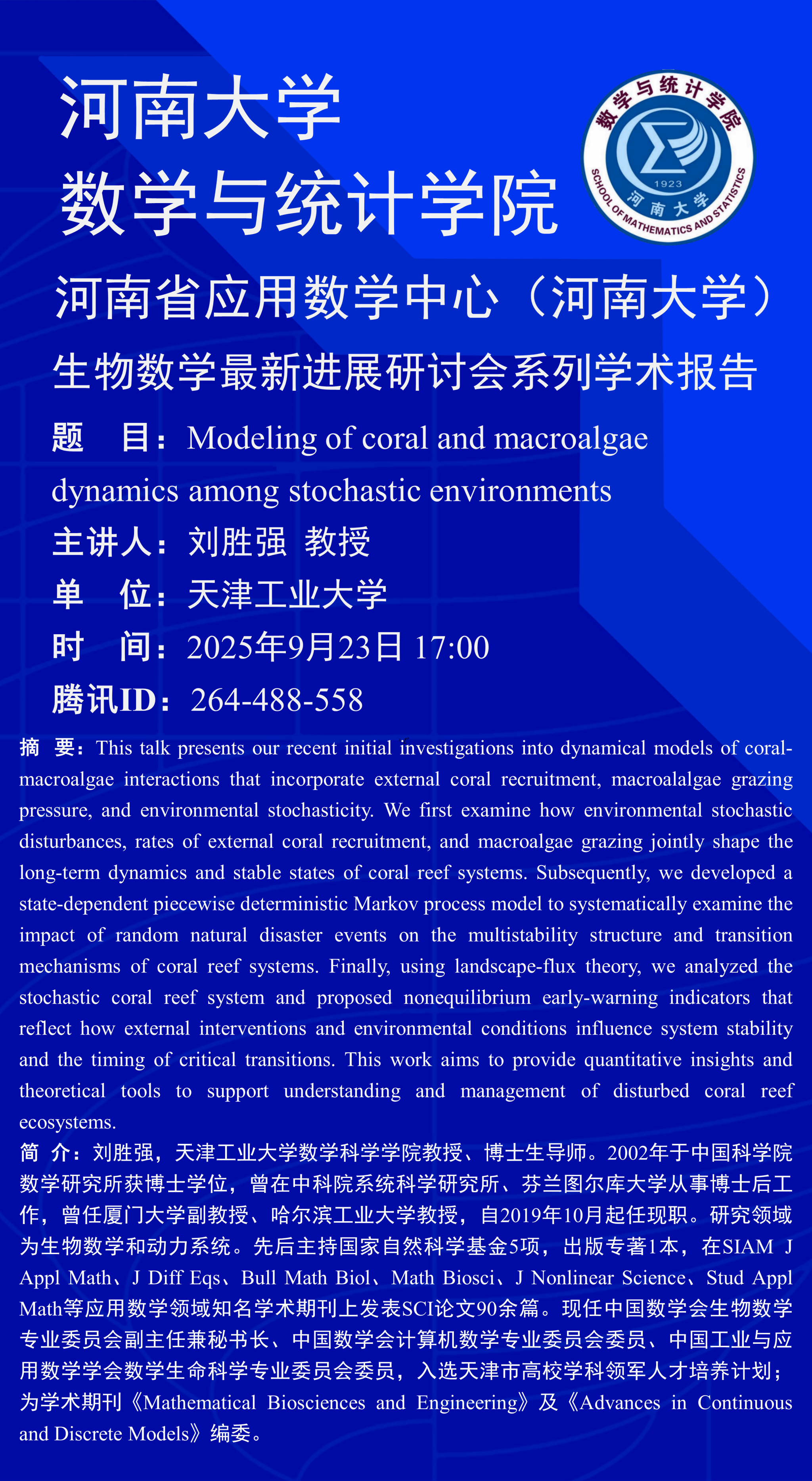 刘胜强:Modeling of coral and macroalgae dynamics among stochastic environments(时间:9月23日)