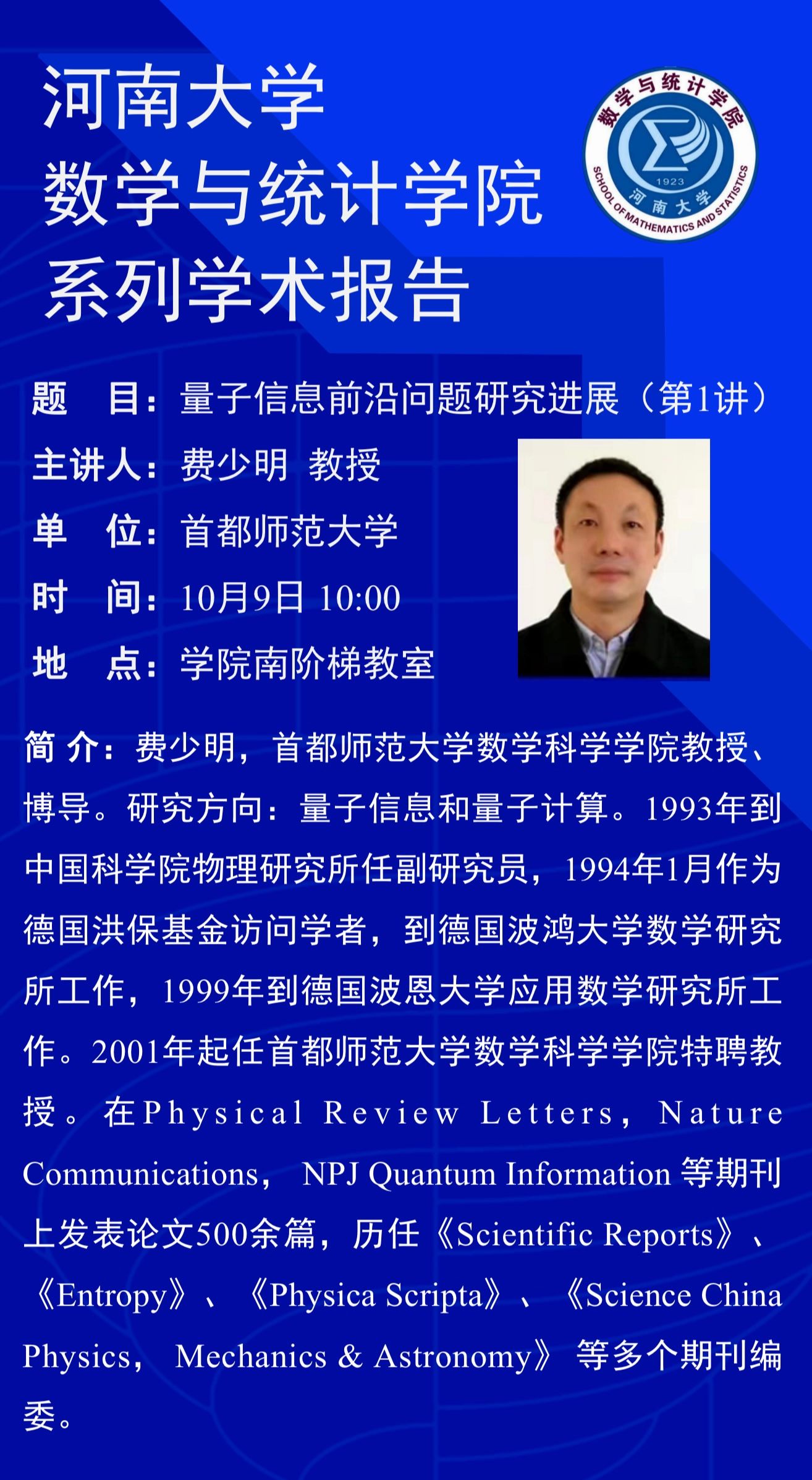 费少明 :量子信息前沿问题研究进展(第1讲)(时间:10月9日)