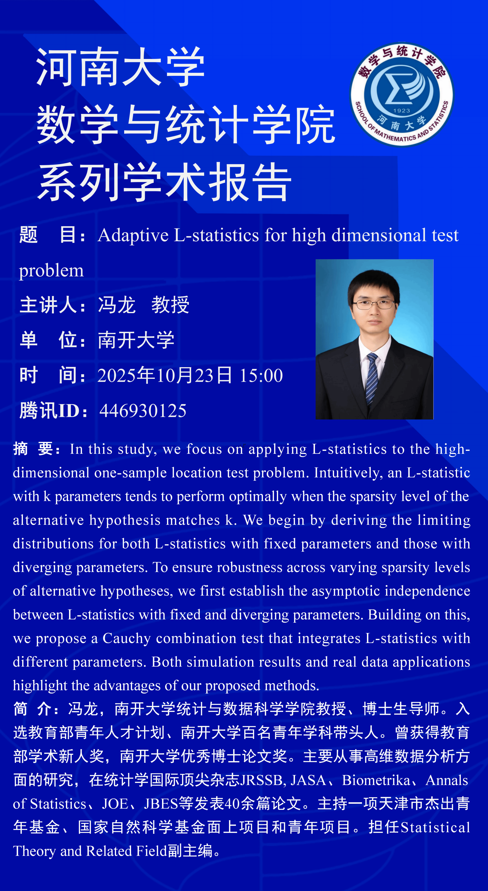 冯龙 :Adaptive L-statistics for high dimensional test problem(时间:10月23日)