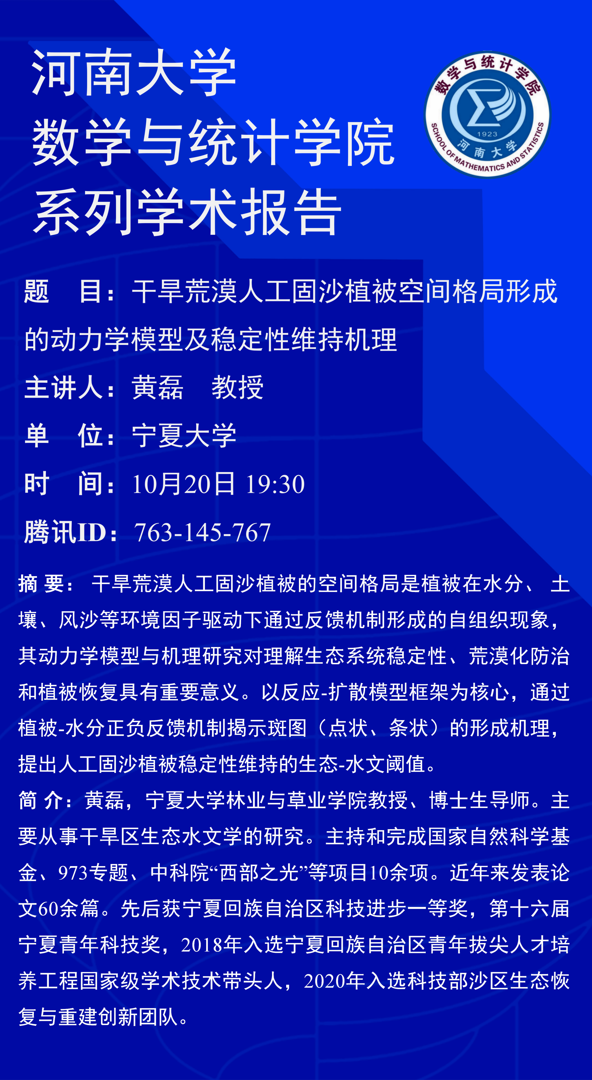 黄磊:干旱荒漠人工固沙植被空间格局形成的动力学模型及稳定性维持机理(时间:10月20日)