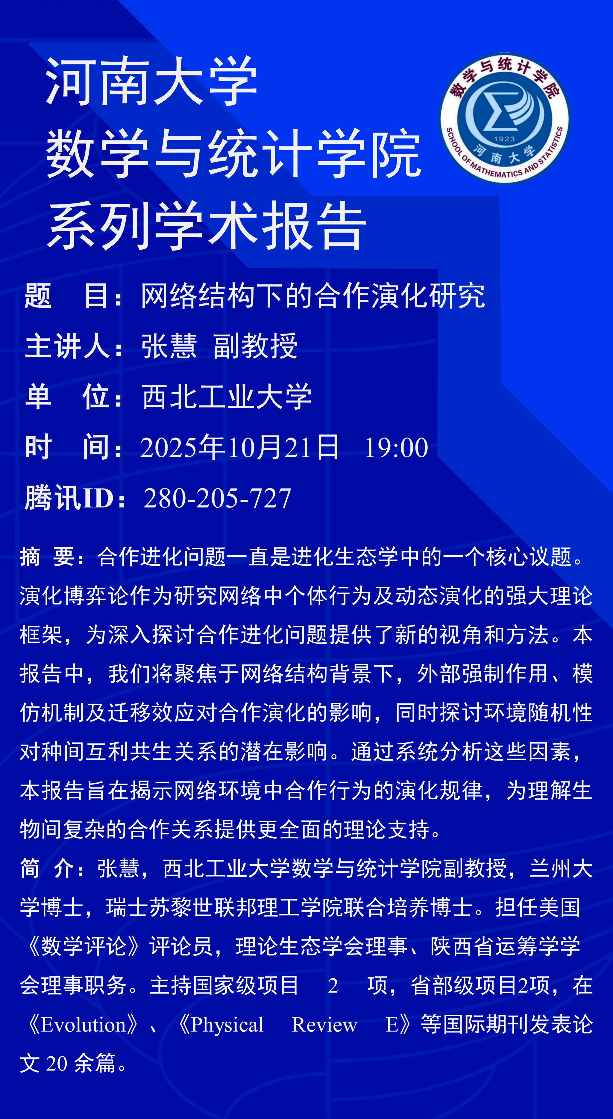 张慧:网络结构下的合作演化研究(时间:10月21日)