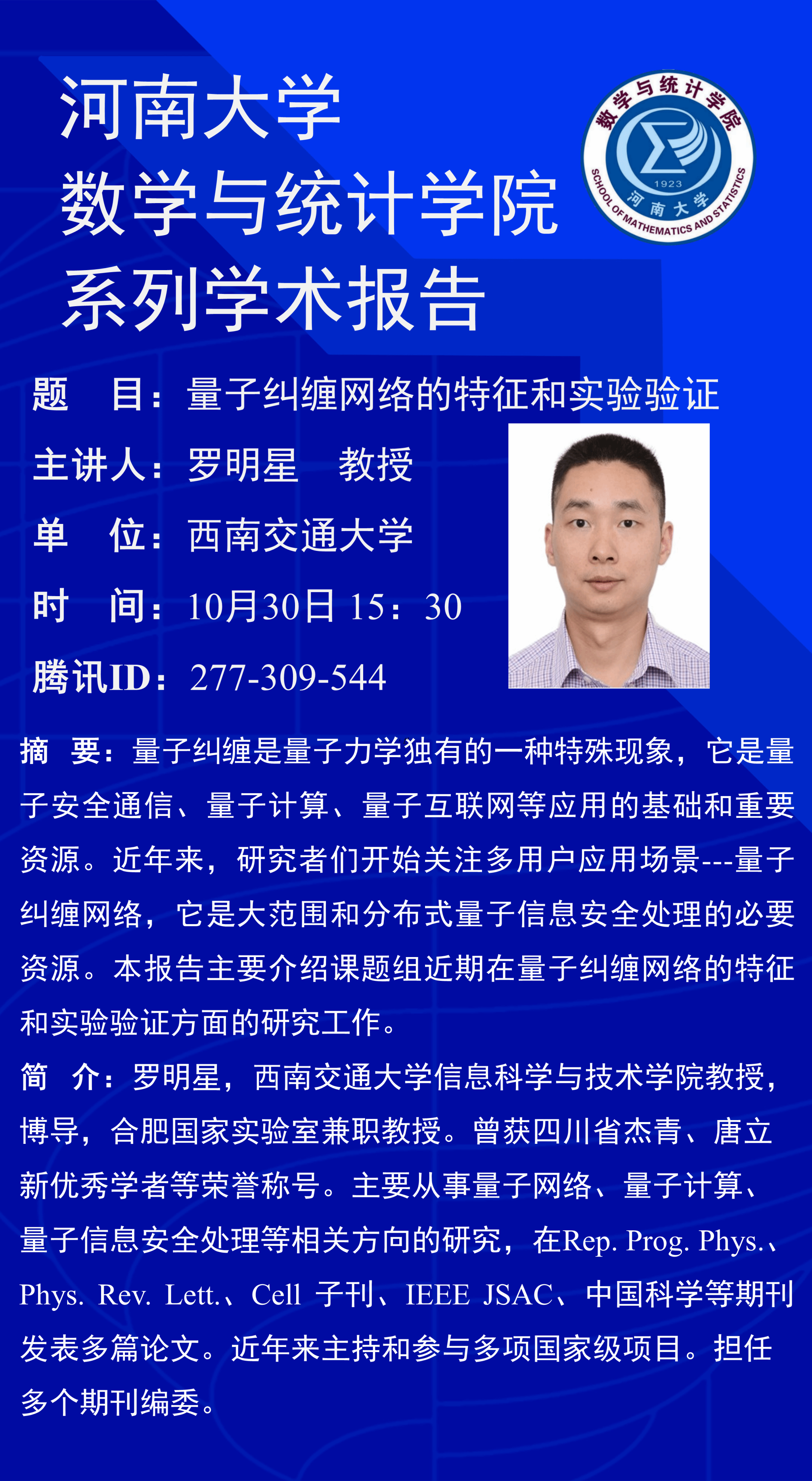 罗明星:量子纠缠网络的特征和实验验证(时间:10月30日)