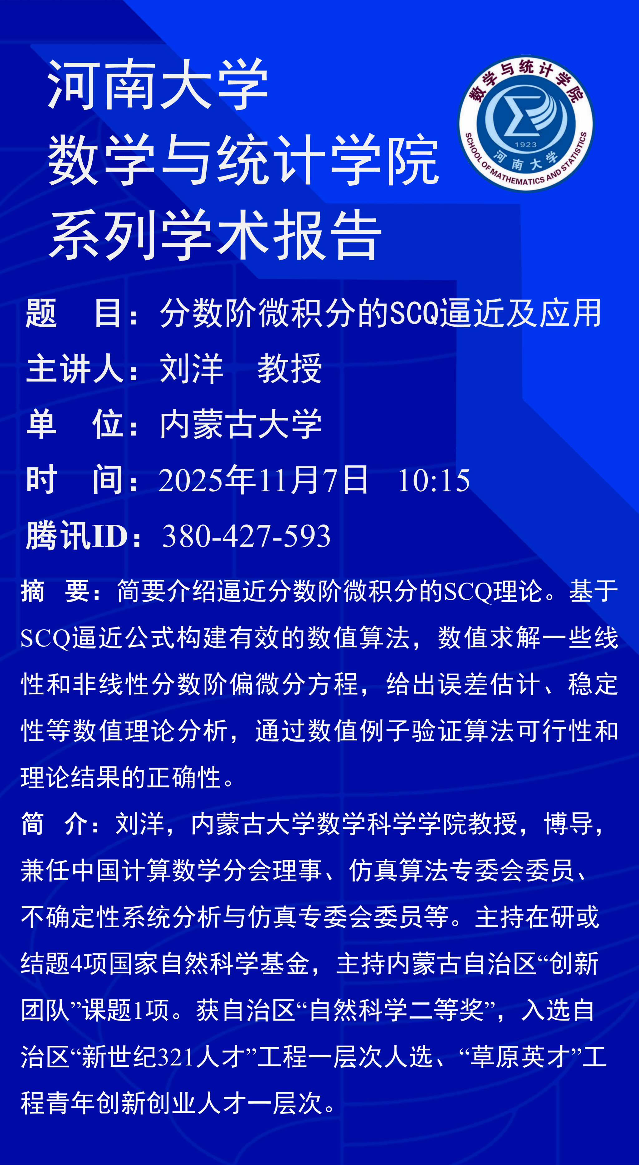 刘洋:分数阶微积分的SCQ逼近及应用(时间:11月7日)