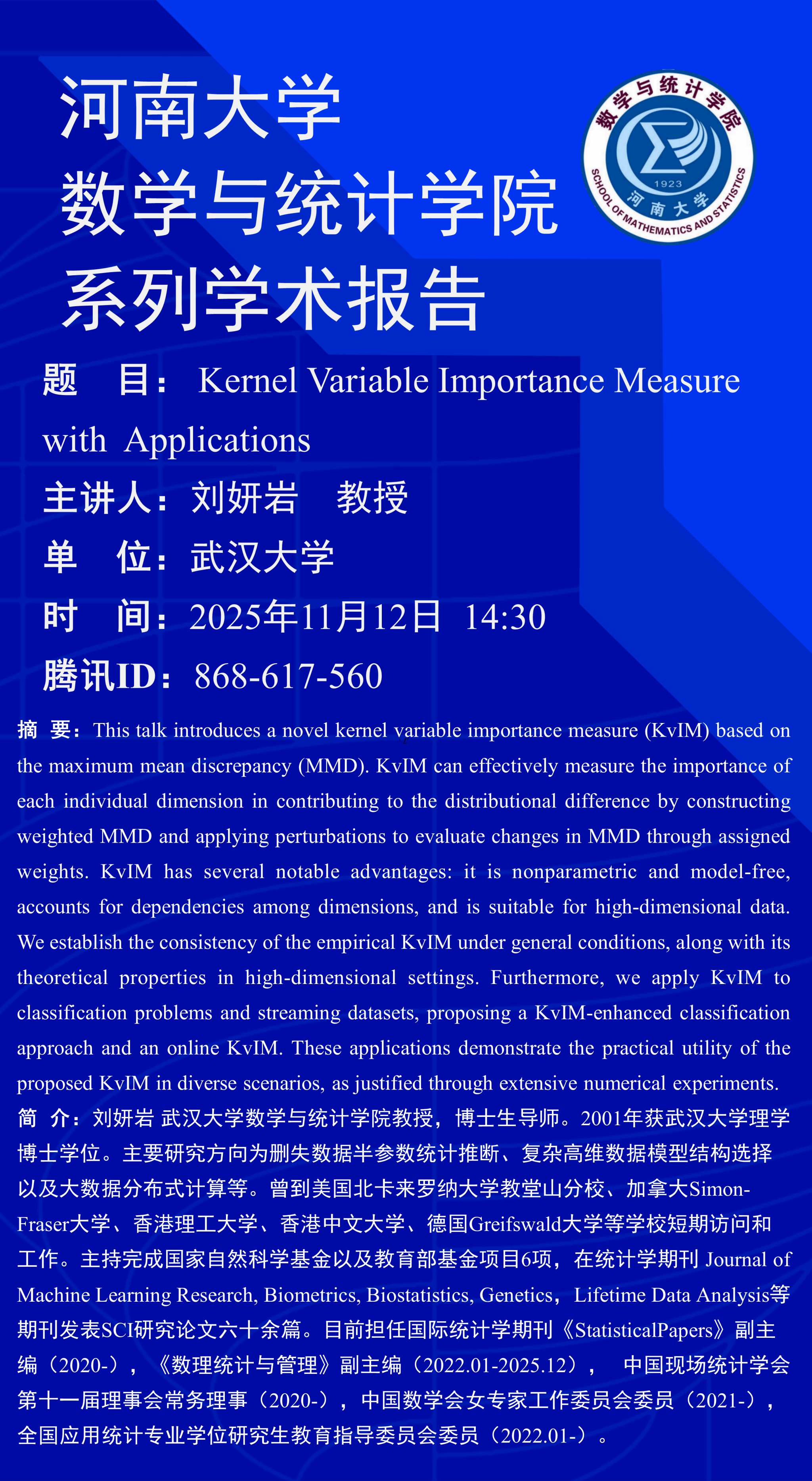 刘妍岩:Kernel Variable Importance Measure with Applications(时间:11月12日)