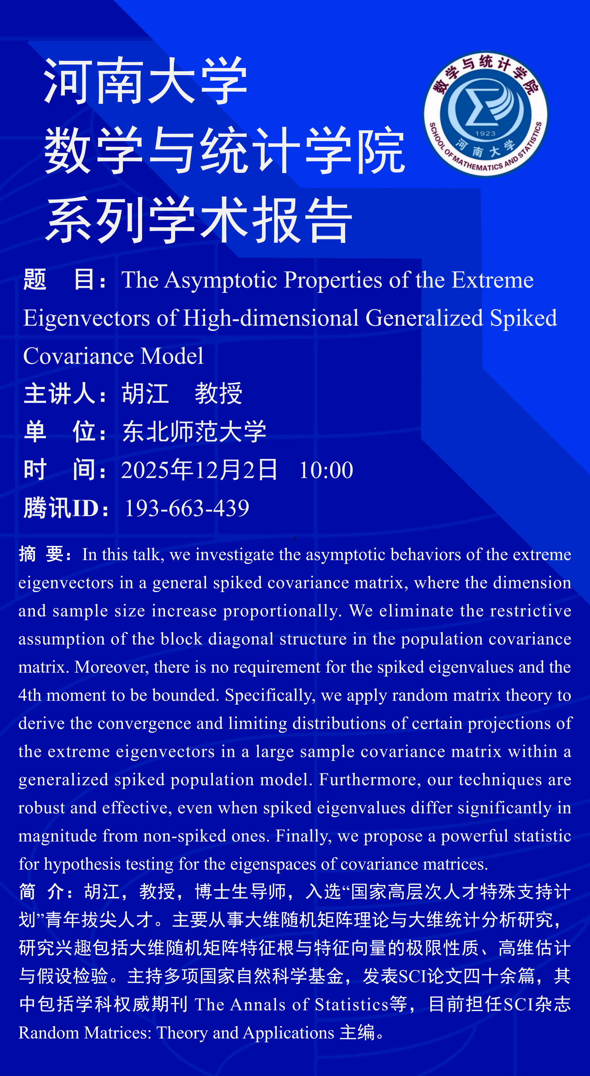 胡江:The Asymptotic Properties of the Extreme Eigenvectors of High-dimensional Generalized Spiked Covariance Model(时间:12月2日)