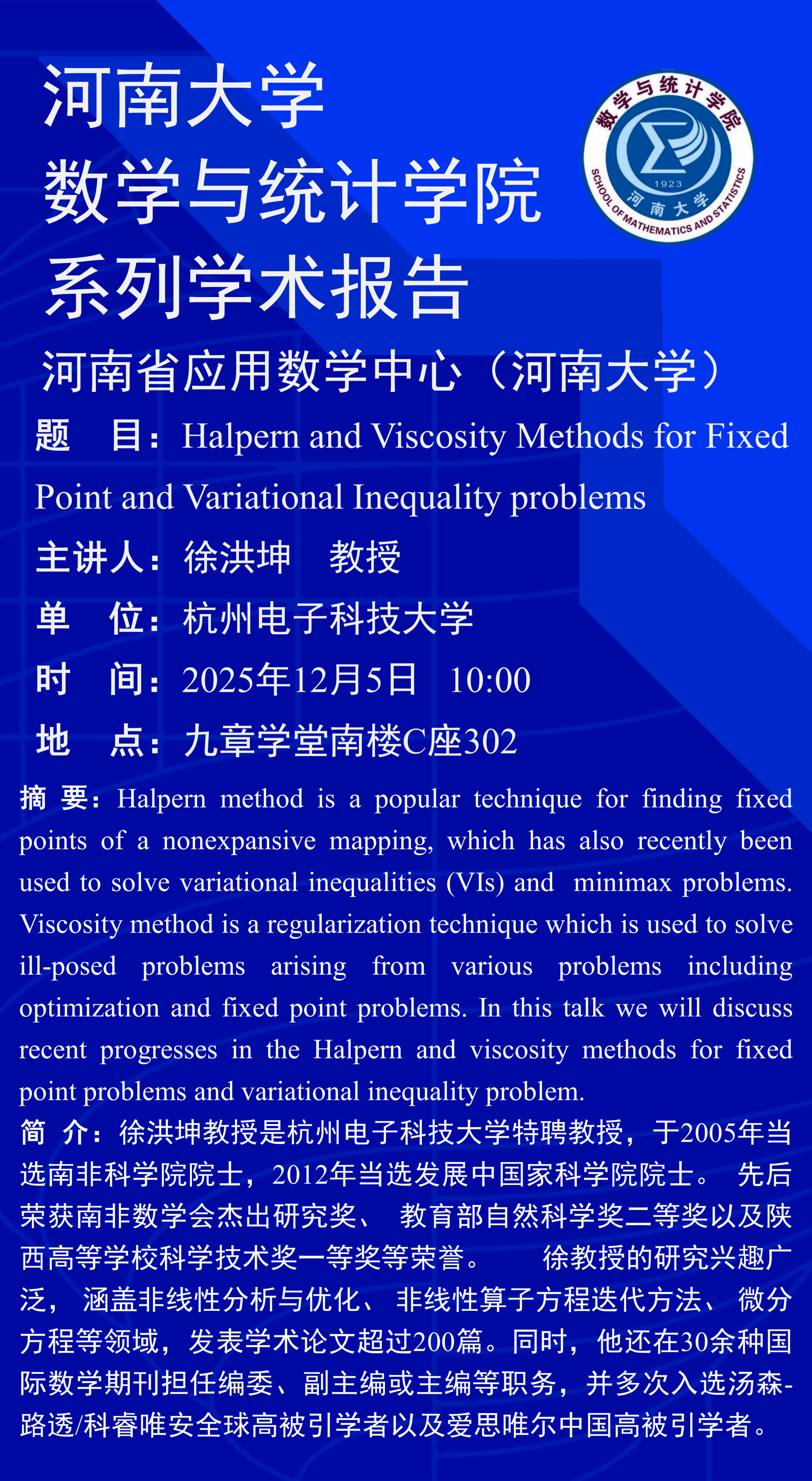徐洪坤:Halpern and Viscosity Methods for Fixed Point and Variational Inequality problems(时间:12月5日)