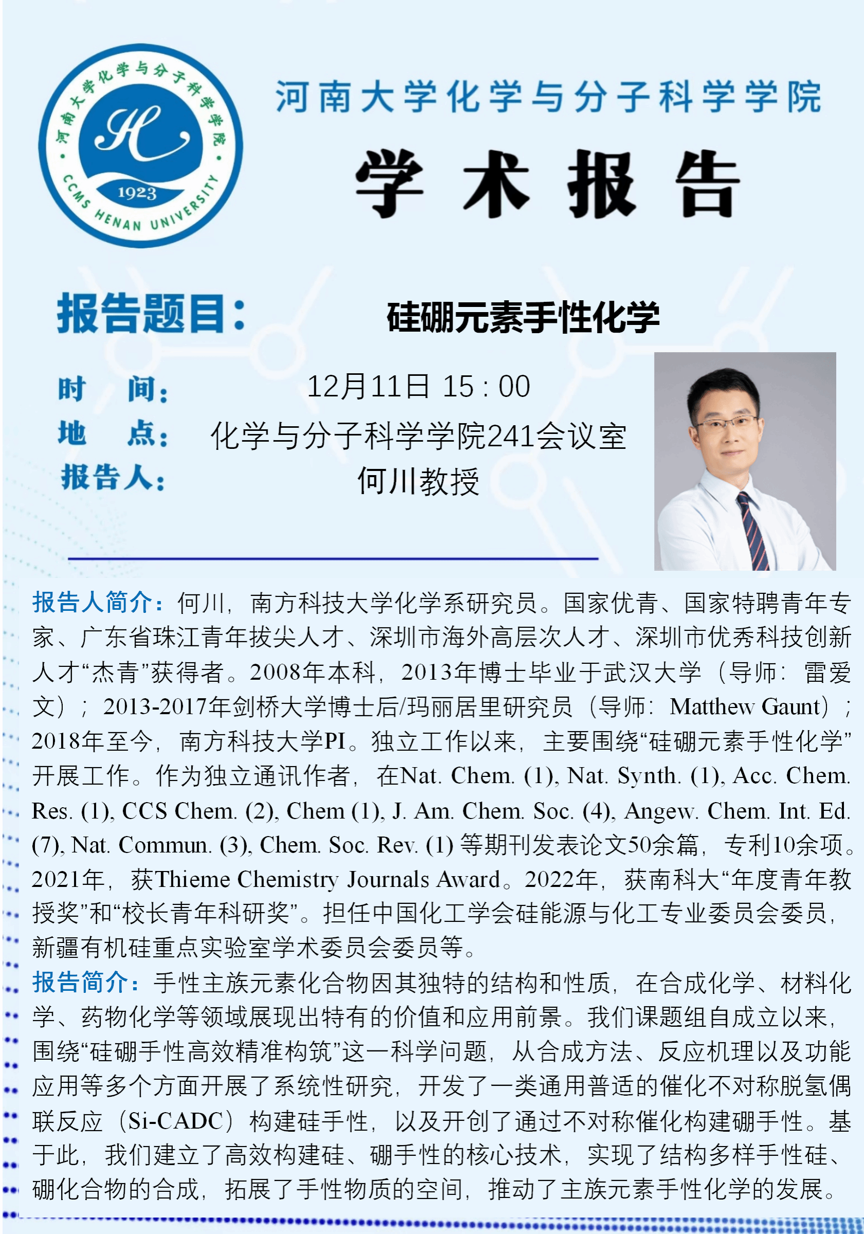 何川:硅硼元素手性化学(时间:12月11日)