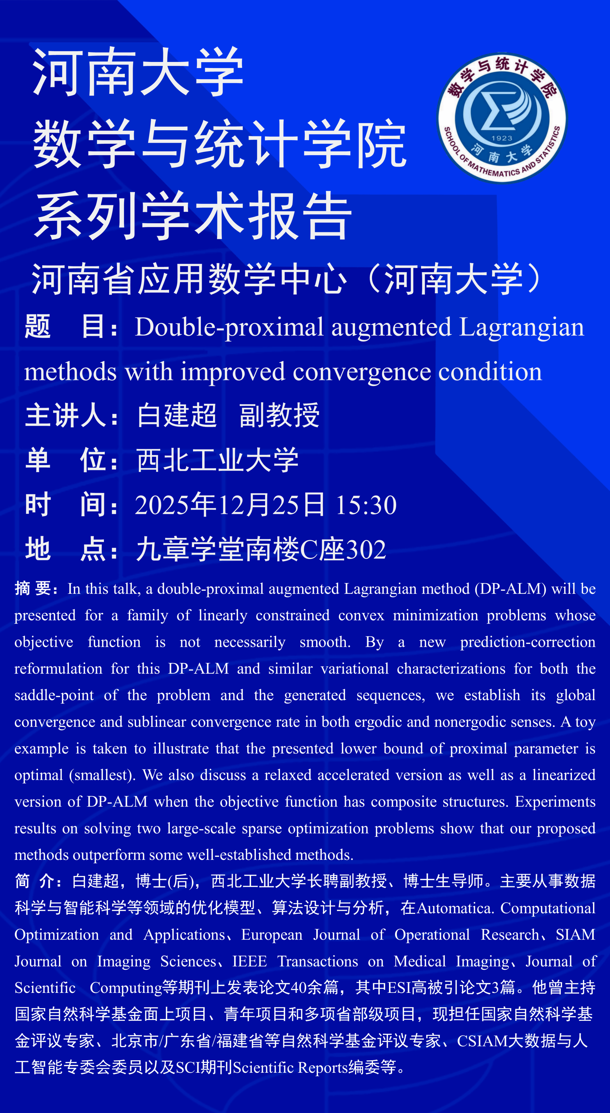 白建超:Double-proximal augmented Lagrangian methods with improved convergence condition(时间:12月25日)