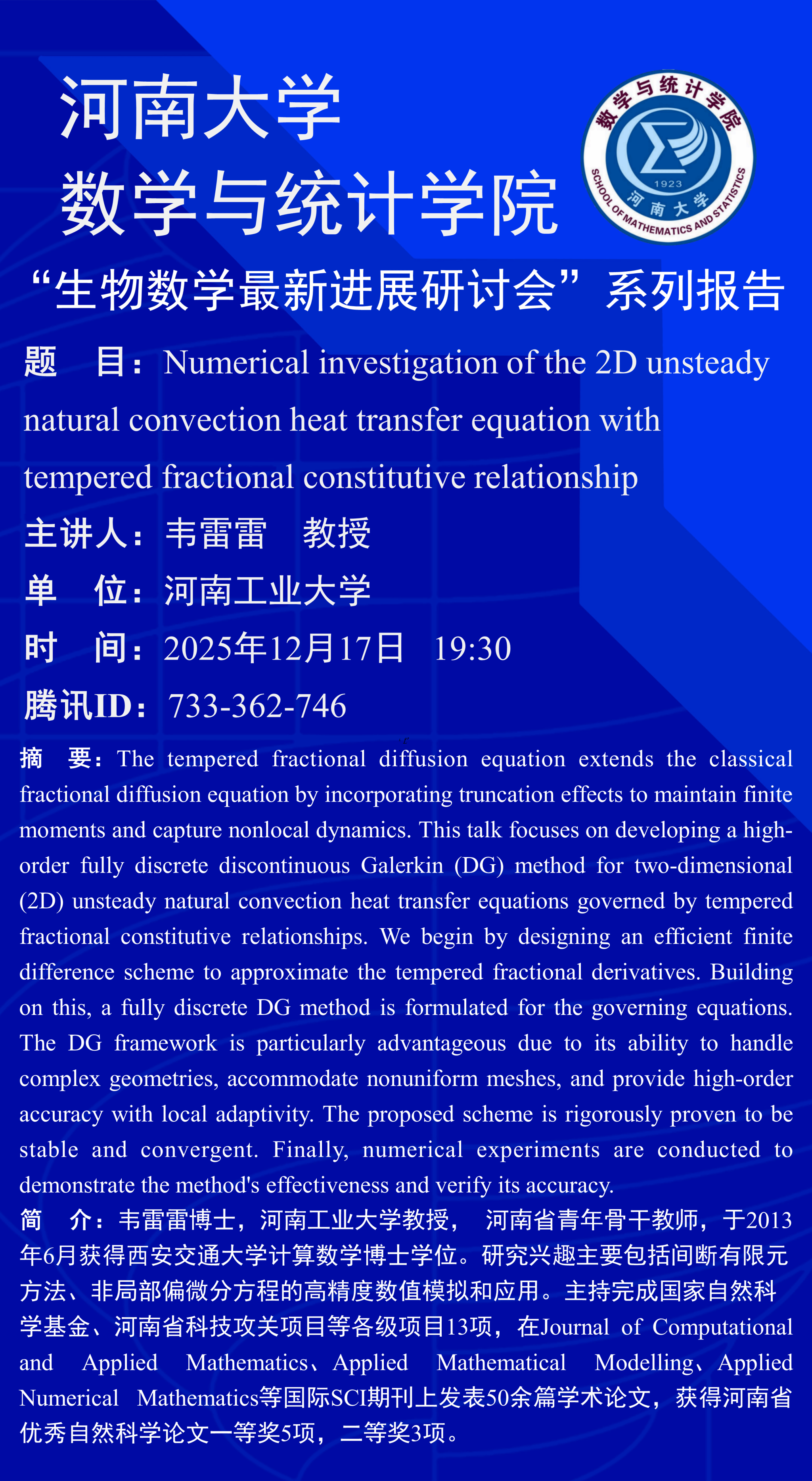 韦雷雷:Numerical investigation of the 2D unsteady natural convection heat transfer equation with tempered fractional constitutive relationship(时间:12月17日)