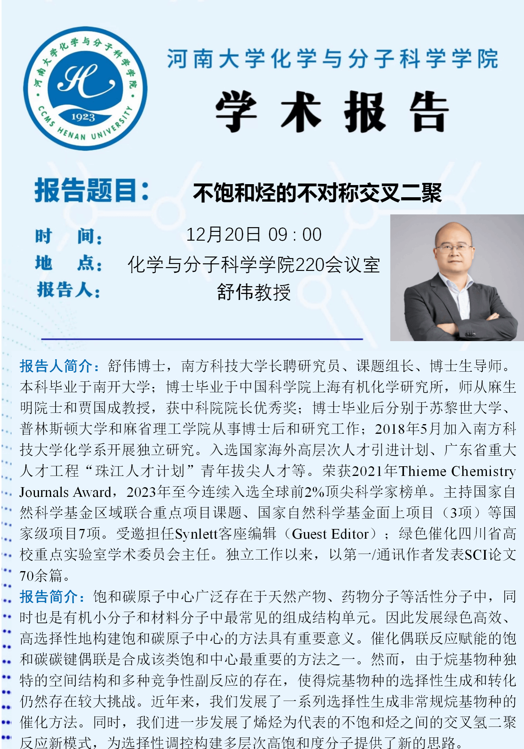 舒伟:不饱和烃的不对称交叉二聚(时间:12月20日)