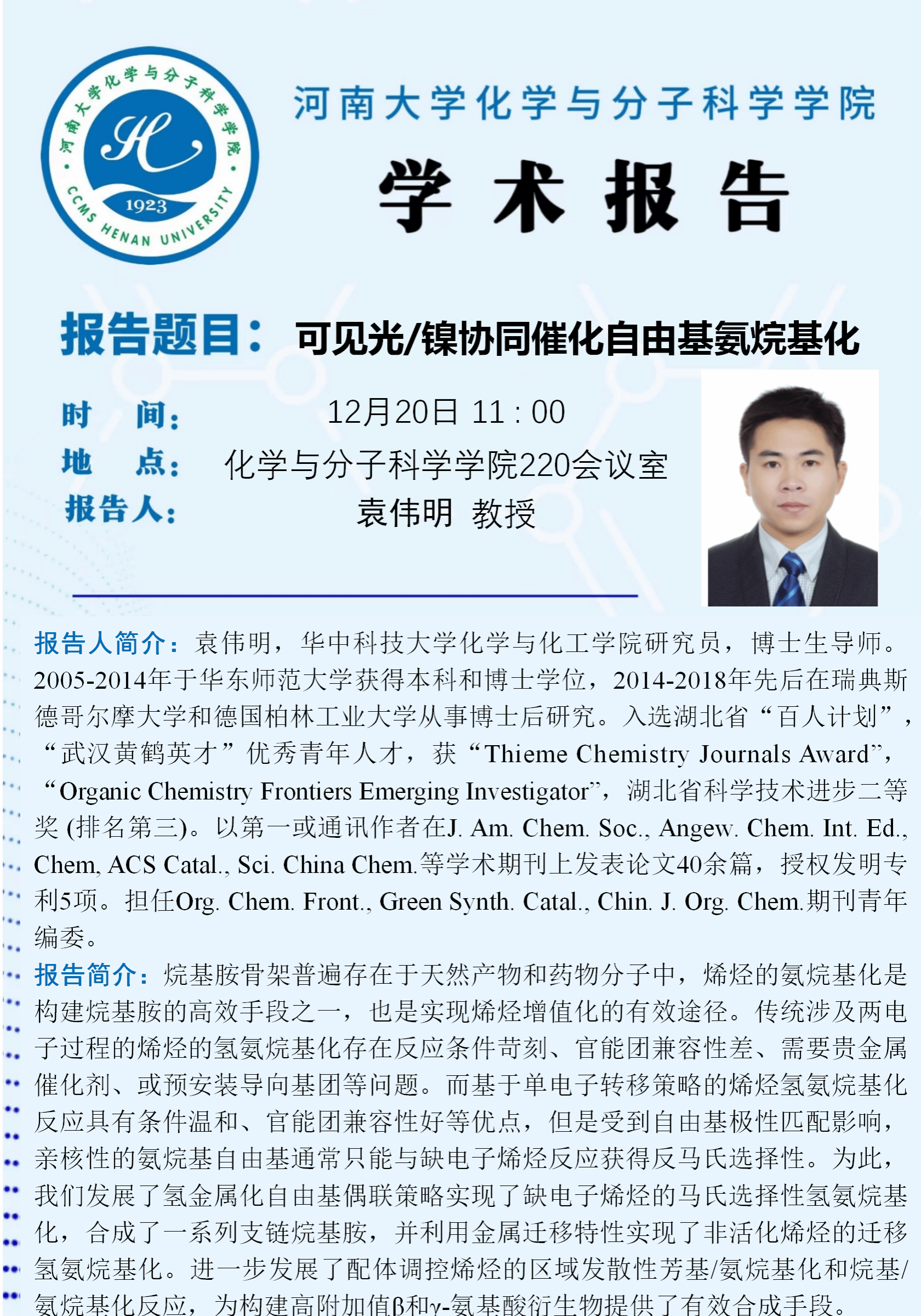 袁伟明:可见光/镍协同催化自由基氨烷基化(时间:12月20日)