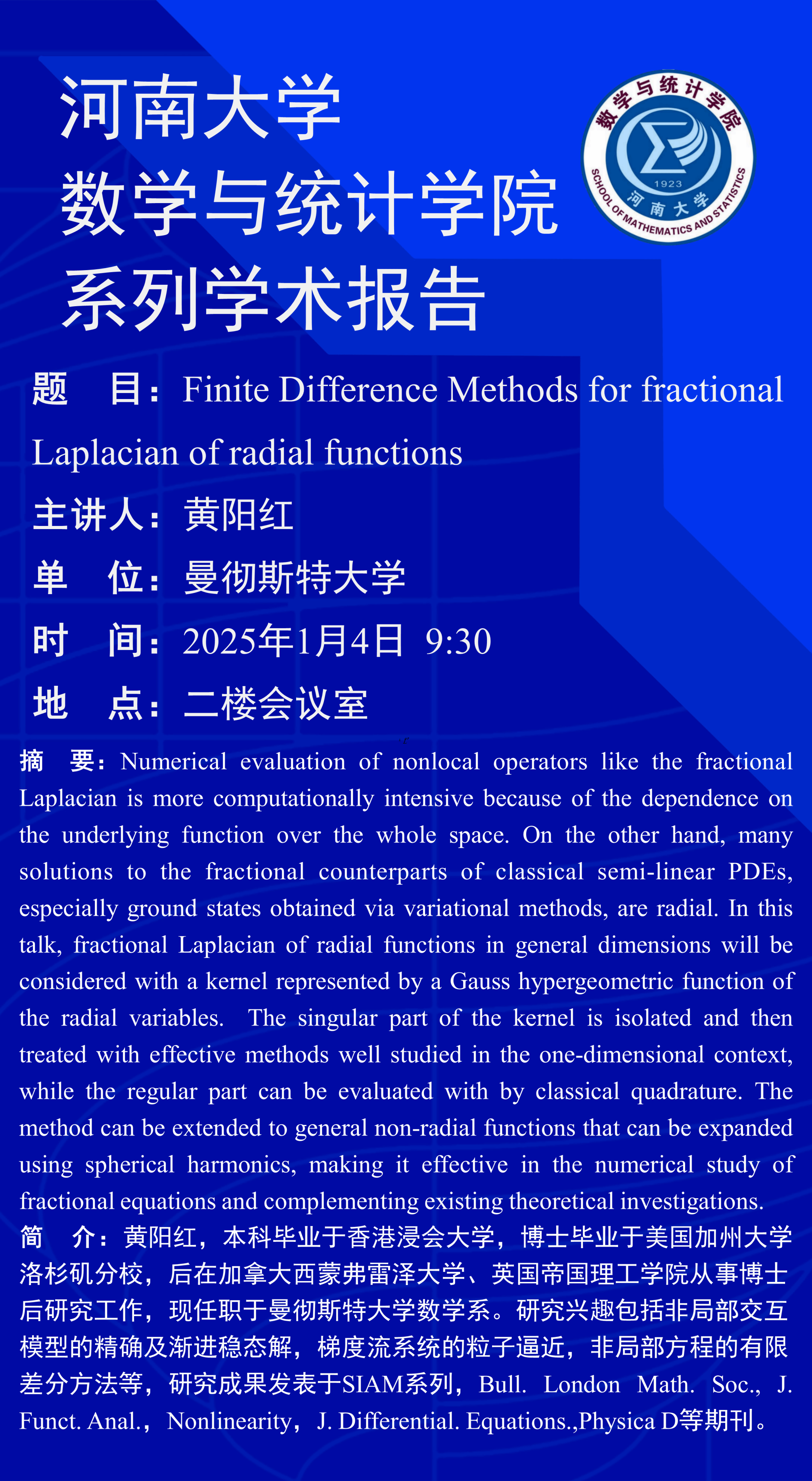 黄阳红:Finite Difference Methods for fractional Laplacian of radial functions(时间:1月4日)