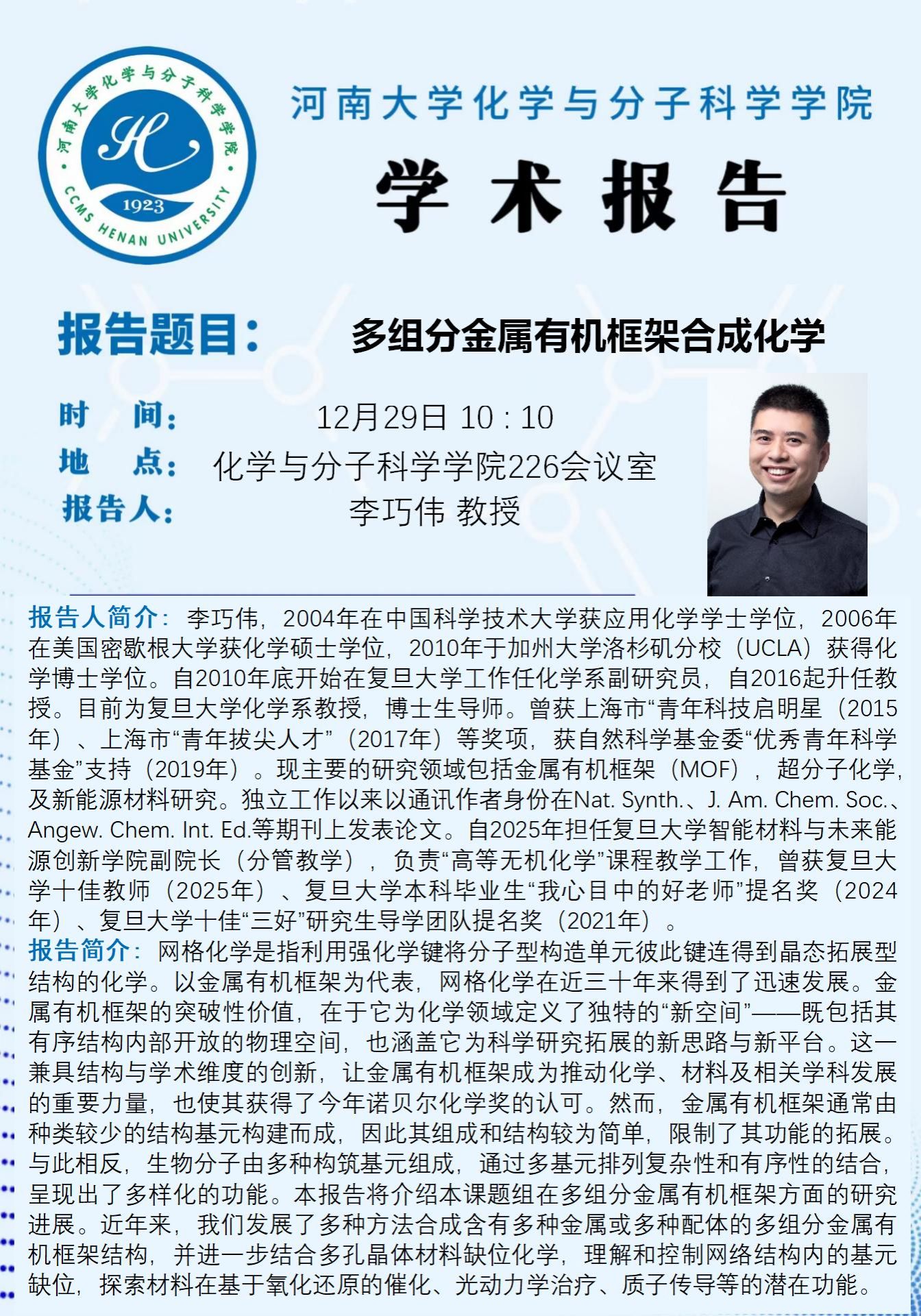 李巧伟:多组分金属有机框架合成化学(时间:12月29日)